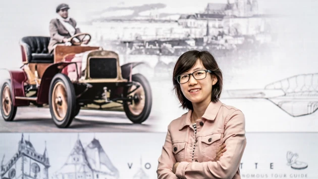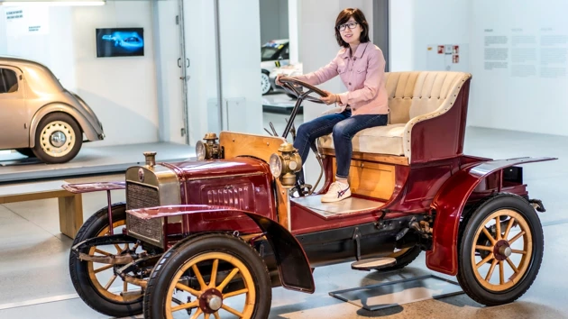 Yuhan Zhang sitter i den ursprungliga Laurin & Klement Voiturette, den historiska modell som inspirerade hennes moderna tolkning, det elektriska konceptet eVoiturette, som visades på Škoda Museum.