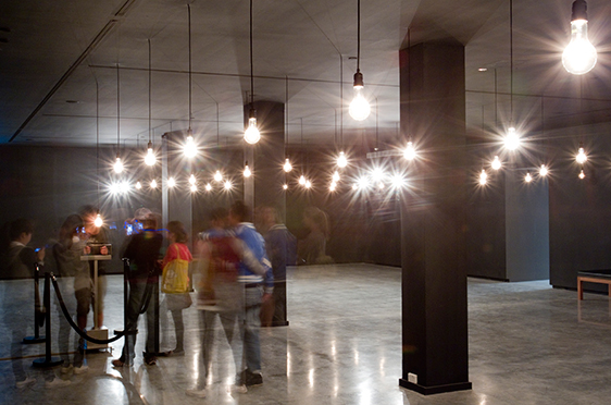 As a visitor, you are invited to be a co-creator. With the help of your movements and heartbeats, the work takes on its own life outside of the artist's control. In Pulse Room, a sea of light bulbs blinks in concert with visitors' pulses. Frequency and Volume is a playful sound installation that visitors influence with their own shadows.