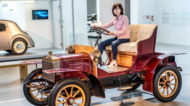 Yuhan Zhang seated in the original Laurin & Klement Voiturette, the historic model that inspired her modern reinterpretation, the electric ‘eVoiturette’ concept showcased at the Škoda Museum.