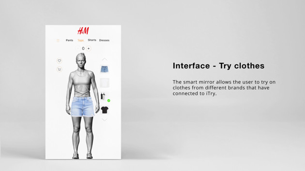 iTry is a concept that aims to minimize returns caused by the wrong fit and size. The concept allows the user to try clothes online and physically. For a perfect fit, the user scans their body in a smart mirror, that scan can then be saved to an app in the user's phone. Trying on clothes online is almost the same as in a physical store. Fashion companies that focus on e-commerce can subscribe to iTry's service and then customers can test their collections in iTry's store and app.