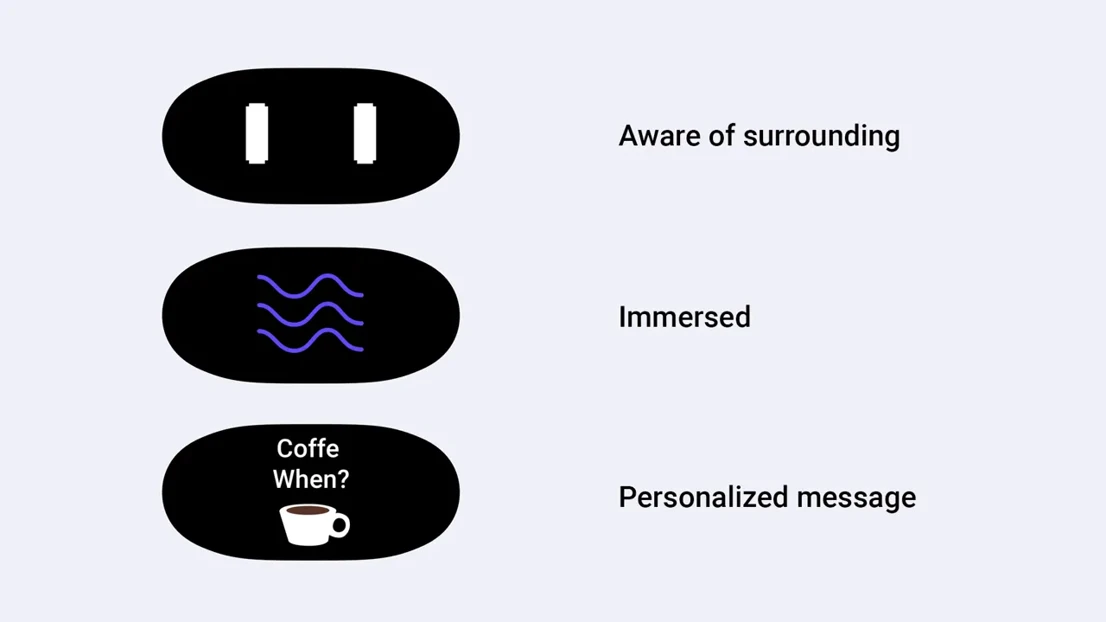 The front can be folded up to rest the eyes or to enable more natural conversations with people in the office