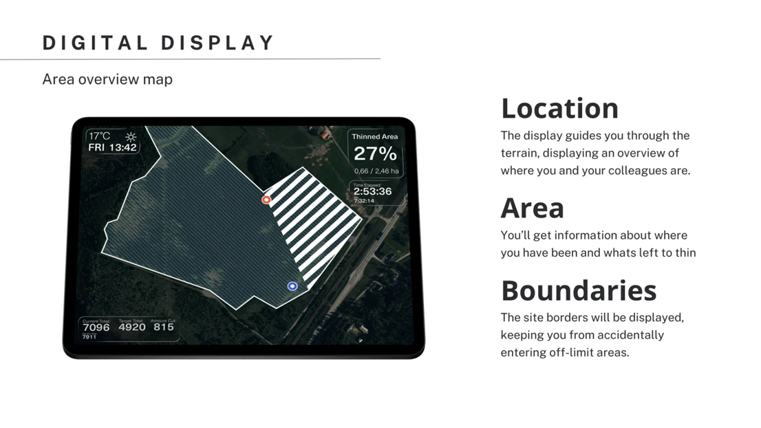 CĀRE is a device designed to support forestry workers by evolving the traditional thinning saw. Featuring a hands-free interface mounted on the saw’s handlebars, it provides automatic tree population measurement through augmented reality, map overviews with real-time thinning progress, beginner tutoring, media controls, and more. This makes thinning smarter and more efficient.