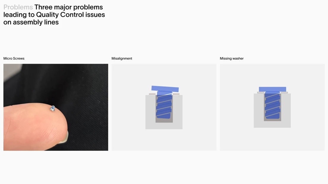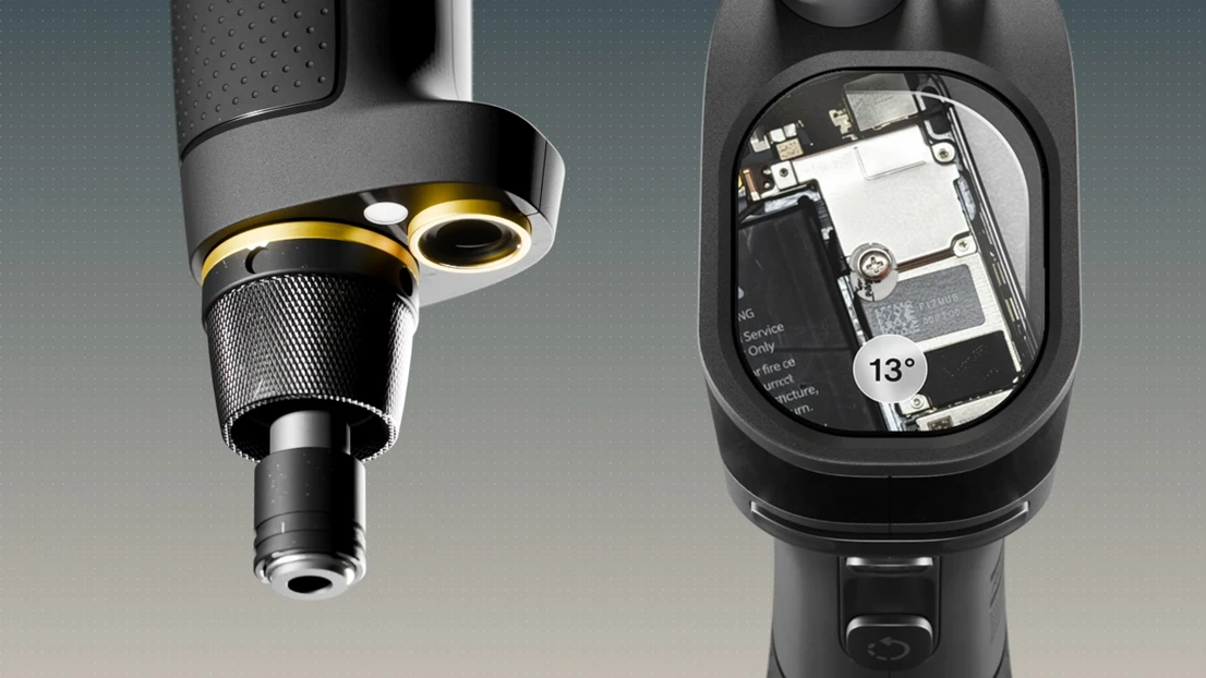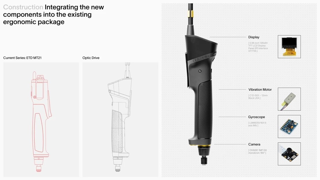 Optic Drive is a next‑generation low‑torque assembly tool that gives operators clearer, more actionable feedback to prevent common quality issues. By combining visual cues, haptics, tilt control, magnification, and real‑time graph interpretation, the tool helps users detect missing components, avoid misalignment, and work confidently with very small parts. The design integrates these advanced features into an intuitive, ergonomic package that supports operators’ judgement and promotes more reliable, precise, and sustainable assembly outcomes.
