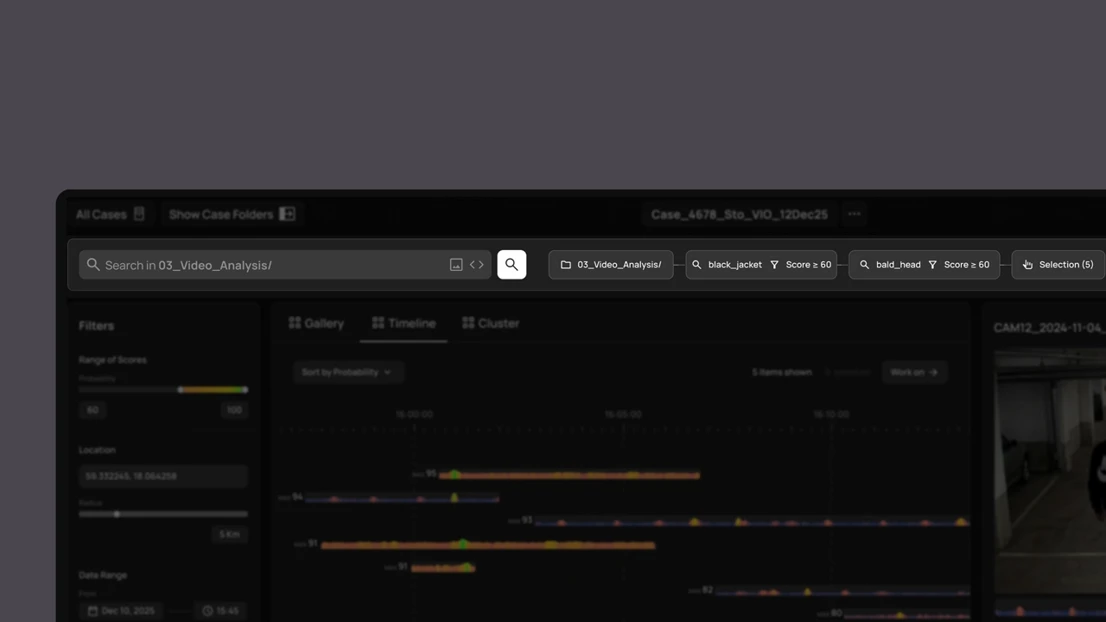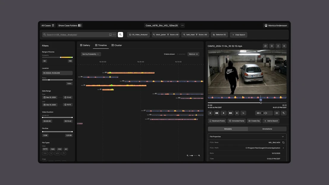 Police investigations often involve large volumes of footage that must be reviewed within limited timeframes. This project examines how AI and computer-vision can support law enforcement investigators in an agency-driven, efficient, and iterative manner. Our research shows that investigative work varies considerably depending on the investigator, the type of case, and the stage of the investigation. To account for this variation, the system uses an open UI architecture and presents data in multiple forms to support different workflows. Searches are constructed as stacked steps, enabling iterative work while keeping transparency and reducing errors. Data is shown through gallery, timeline, and cluster views. Together, these design choices aim to better support real investigative practices.