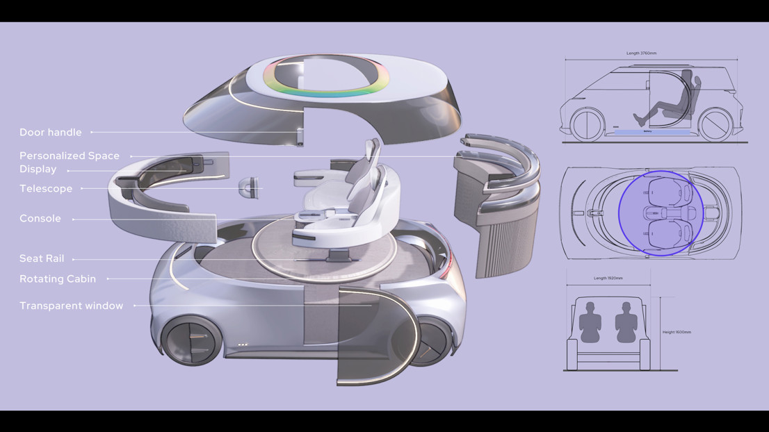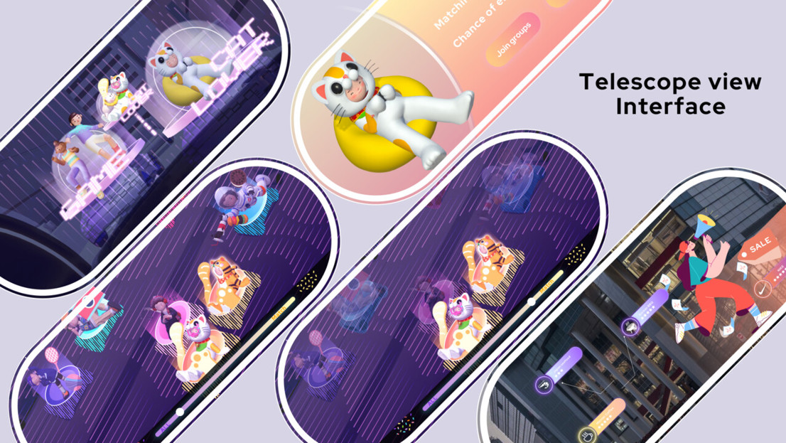I get inspiration from the telescope, which people use to observe the scenery far away. People can see the real world through it and adjust their vision intuitively by turning the direction of themselves. With a circular rotating cockpit in the middle, users can freely adjust the direction as they want In the explore mode. In the Connect mode, the cabin would rotate to a 90-degree angle and the middle window become the main interaction interface.