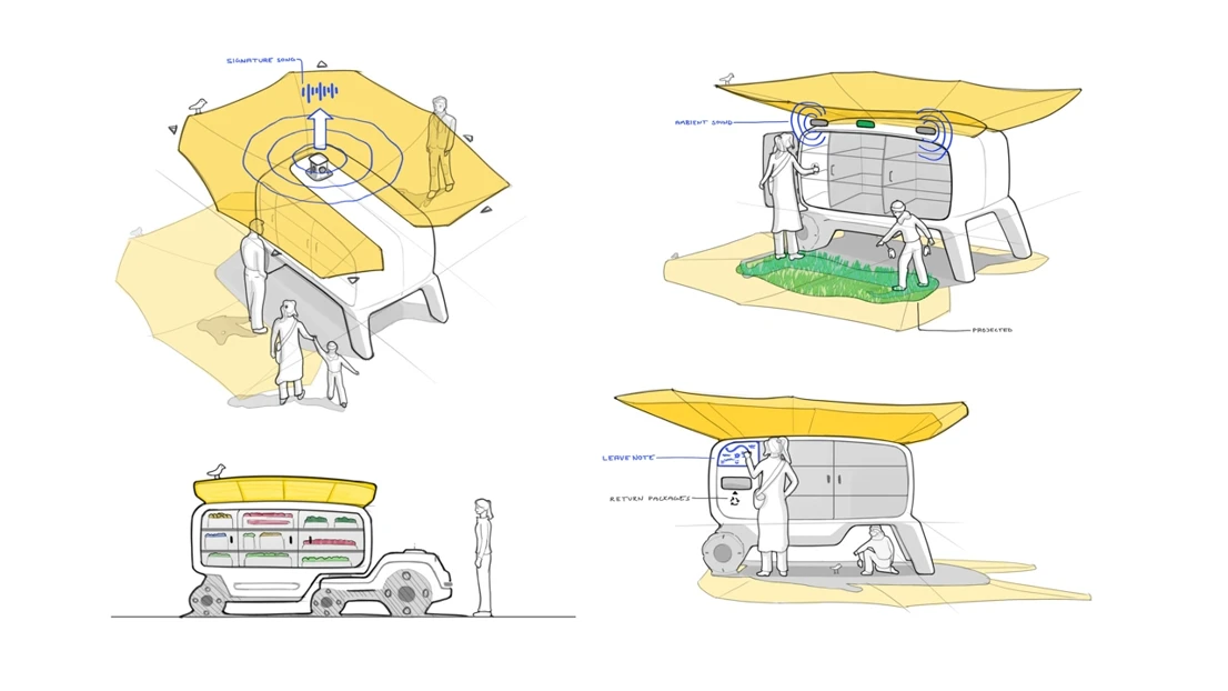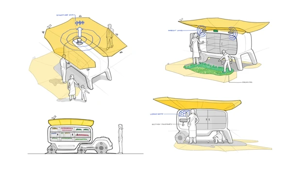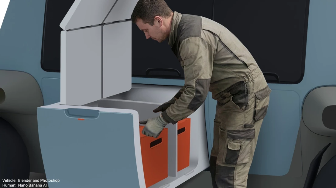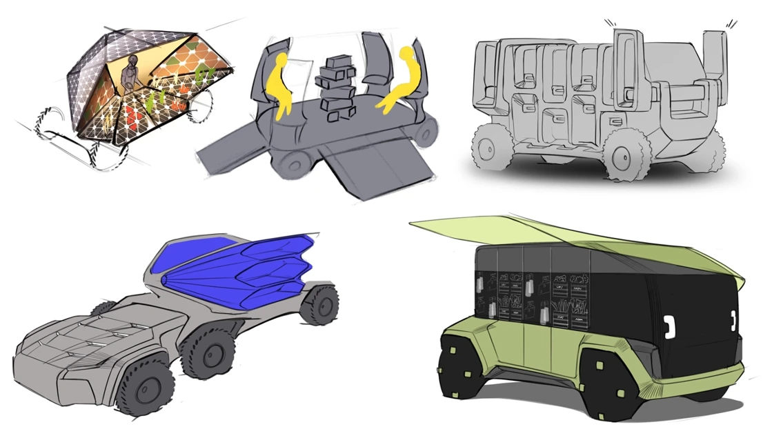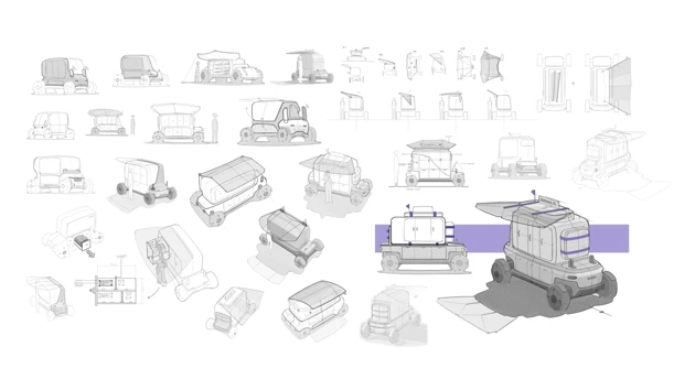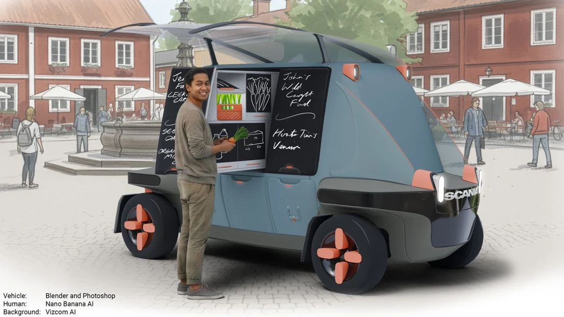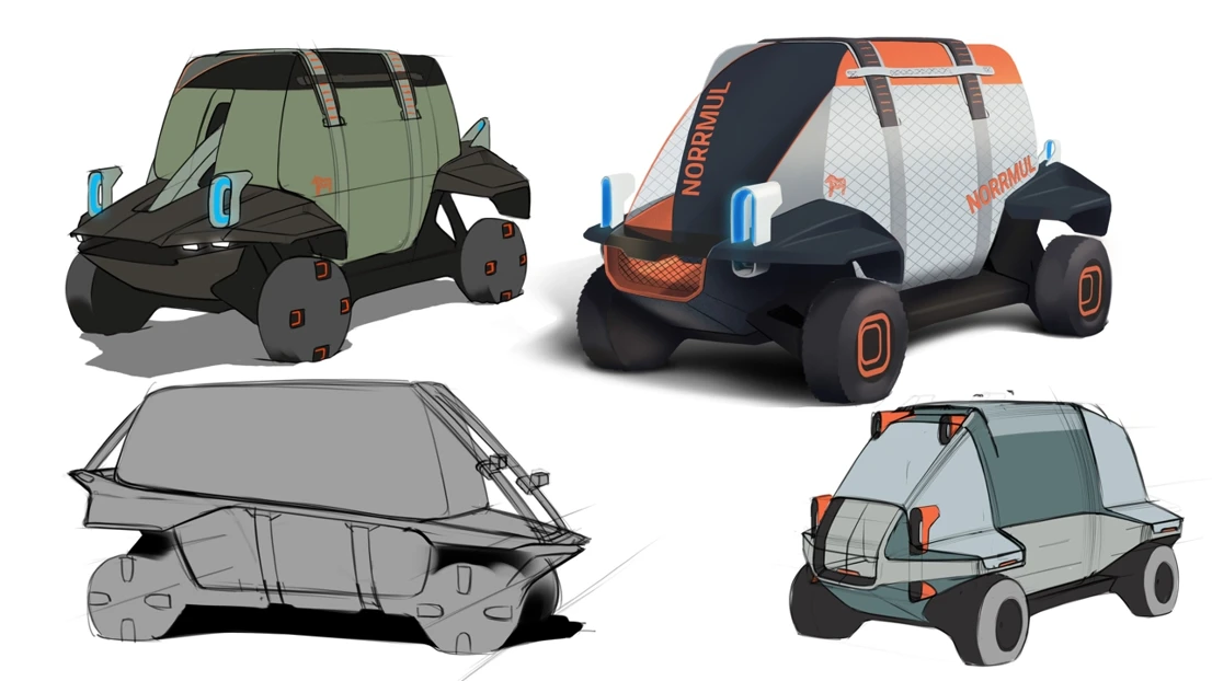 Students begin with a compact platform designed for efficiency and tough Nordic conditions, then develop vehicle concepts that support people, goods and public services. The proposals are also intended to be adaptable for future urban use. The course combines hand sketching, Photoshop rendering and CAD with AI supported visualisation, allowing students to compare traditional and emerging tools while reflecting on creativity, reliability and ethics in design workflows.