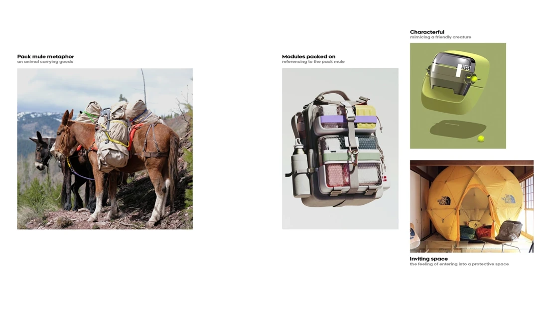 Concept refinement: My version of the package took inspiration from a hardy working animal carrying a backpack, and I focused on a mix of fabrics as well as robust fenders to give a tough, capable impression. This metaphorical approach got refined and simplified over time.