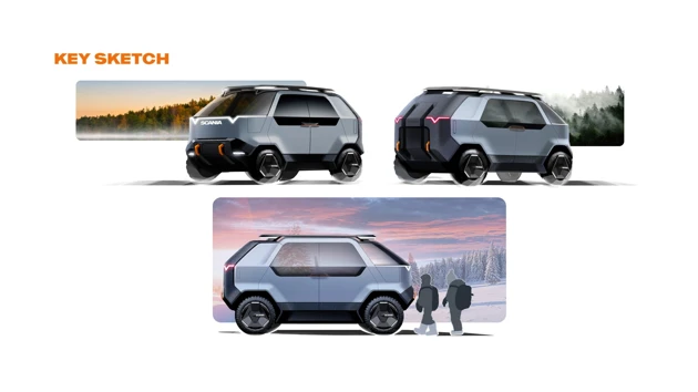 Students begin with a compact platform designed for efficiency and tough Nordic conditions, then develop vehicle concepts that support people, goods and public services. The proposals are also intended to be adaptable for future urban use. The course combines hand sketching, Photoshop rendering and CAD with AI supported visualisation, allowing students to compare traditional and emerging tools while reflecting on creativity, reliability and ethics in design workflows.