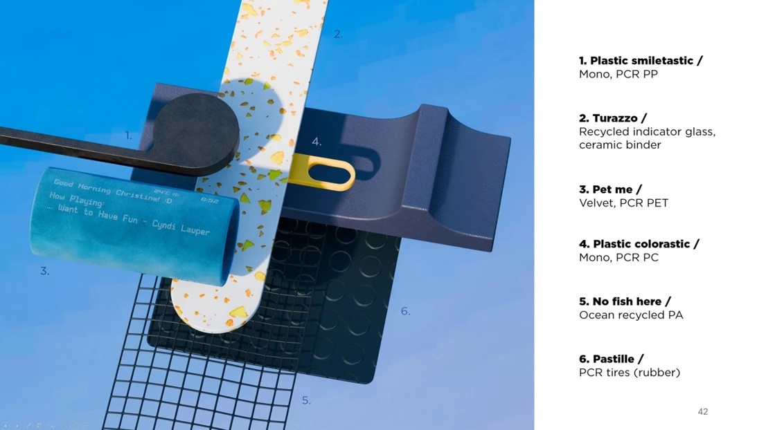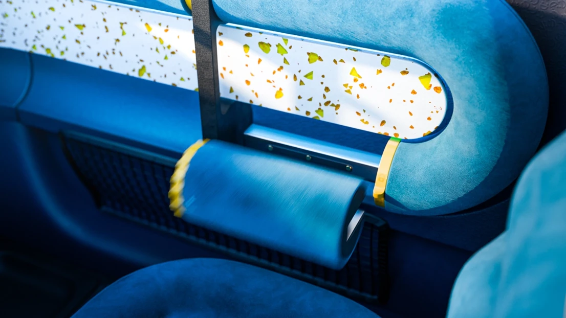 Our interior uses six unique materials designed to delight Christine and ensure easy cleaning, prioritizing mono-materials and post-consumer recycled content wherever possible.