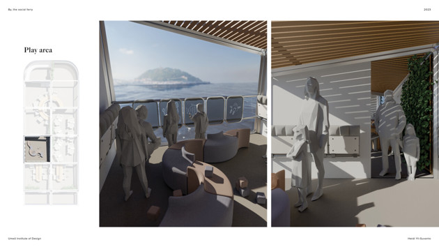 By’s purpose is to provide a platform that encourages social connections, especially in newly constructed floating communities. Taking into account social psychology, user interviews, interaction design, and designing for accessibility and inclusivity, the layout and usage of a traditional passenger ferry was transformed into an inviting space. Principles of architecture, interior design, and public space design were researched and utilized in the concept. Sustainable design, especially circularity and end-of-life recycling determined the construction from identical modules to the seat designed for quick assembly and disassembly.