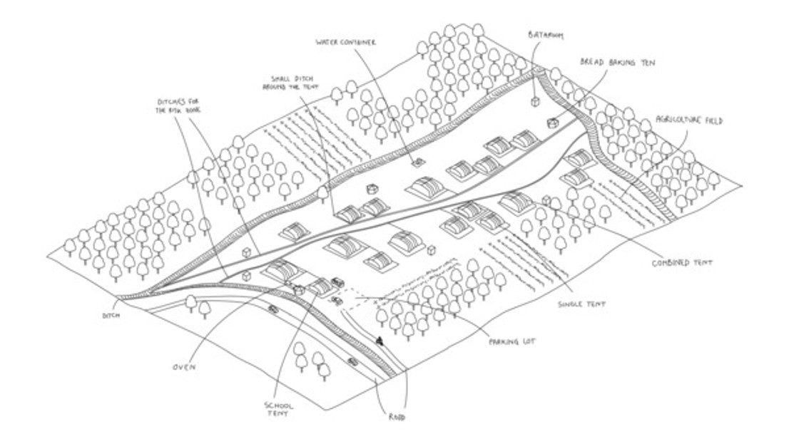 As a group, we have mapped the social and physical context of the camp, and developed strategies on how to improve the lightweight, temporary shelters refugees in general, and the specific camp inhabitants in particular, live in. These strategies include laying out the camp (taking the site- and weather conditions into account), drainage, insulation, heat storage through thermal mass, a passive floor heating system, as well as a second skin structure with an included kitchen.