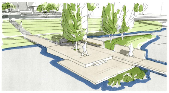Bro och bryggor på ön i dammen. Bild: Akademiska hus
