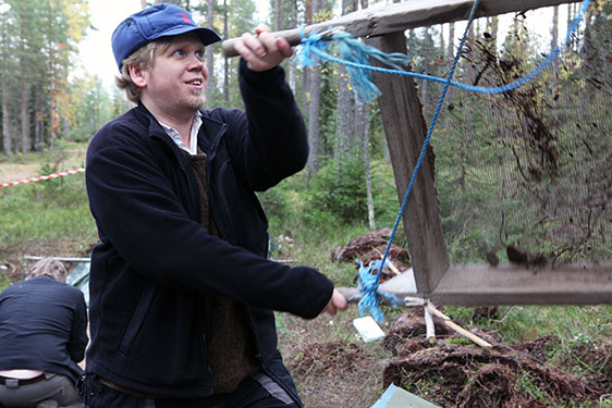Peter Holmblad silar jordprover vid utgrävningar i Röbäck Foto: Per Melander, Umu