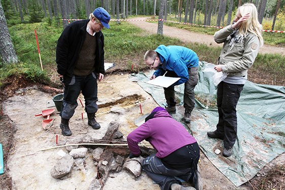 Peter Holmblad granskar tillsammans med studenter en boplats i Röbäck Foto: Per Melander