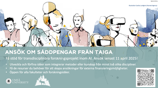 TAIGA är ett fakultetsövergripande centrum vid Umeå universitet, dedikerat till att främja forskning inom artificiell intelligens genom transdisciplinärt samarbete. Syftet med denna utlysning är att ge forskare möjlighet att utveckla och förfina idéer som integrerar metoder eller kunskap från minst två olika discipliner och som gör att den senaste tekniken utvecklas. TAIGAs mål är att tillhandahålla den tid, det resestöd eller de resurser som behövs för att skapa robusta ansökningar för externa finansieringsmöjligheter inom en snar framtid. Den totala tillgängliga summan för denna utlysning är 1 miljon kronor, den maximala summan som tilldelas varje projekt är 100 000 SEK (inklusive alla kostnader och overhead).