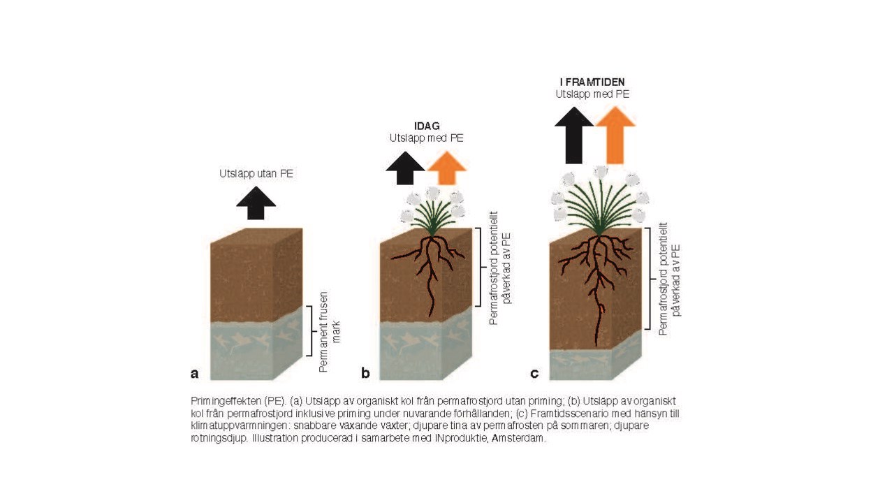 I permafrosten, permanent fryst mark, lagras lika mycket kol som i all jordens växter och atmosfär tillsammans. Ytan på permafrosten tinar på sommaren, och i det allt varmare klimatet frodas växter och mikroorganismer. Det gör att en del av det frusna organiska materialet frisläpps som växthusgaser. Forskare har tidigare förutspått att snabbt stigande temperaturer kommer att orsaka utsläpp av 50-100 miljarder ton kol från permafrost fram till år 2100. Den nya studien har för första gången visat att priming, när växters rötter ”matar” mikroorganismerna i jorden med socker, resulterar i ännu högre utsläpp av växthusgaser.