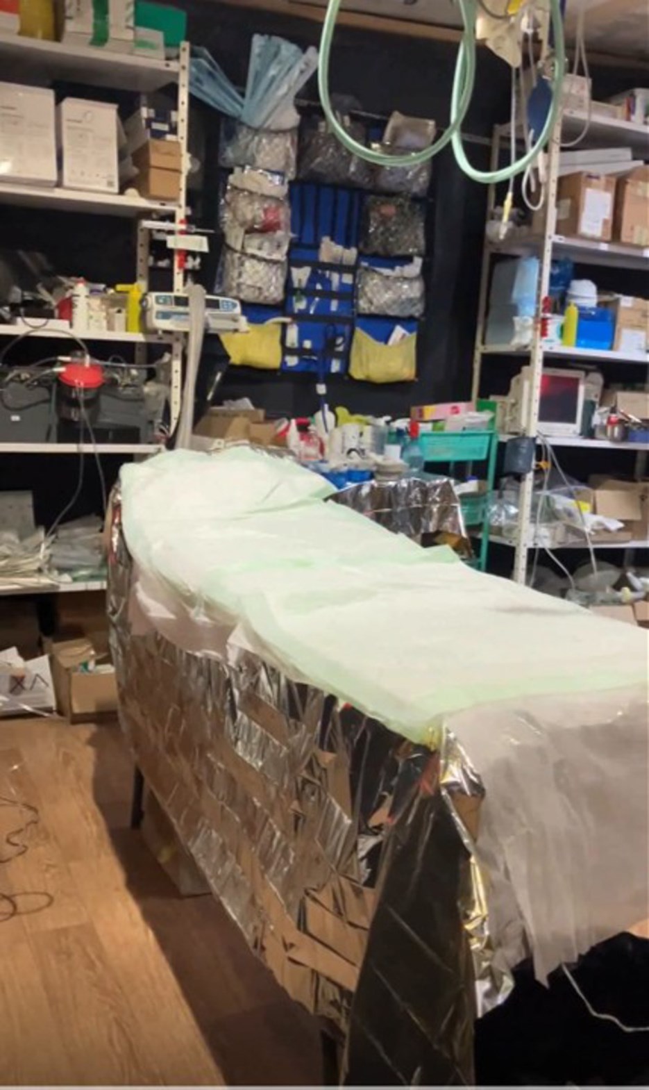 Forskarna besökte ett frontnära stabiliseringscentrum, en av de första instanserna i vårdkedjan för att ta hand om skadade. Dessa inrättningar ligger ofta i källare eller rum under mark för att skydda både personal och patienter. Eftersom man inte ofta kan transportera skadade direkt från fronten till ett sjukhus — varken av säkerhetsskäl eller på grund av brist på tillgängliga fordon — behövs dessa mellanliggande platser. Här kan man ge akutvård innan vidare transport är möjlig. Ju fler sådana stopp som krävs ju längre tid tar det innan den skadade får definitiv vård, och desto mer avancerad vård kan behövas under tiden. Men utifrån krigets förutsättningar är det helt nödvändigt.